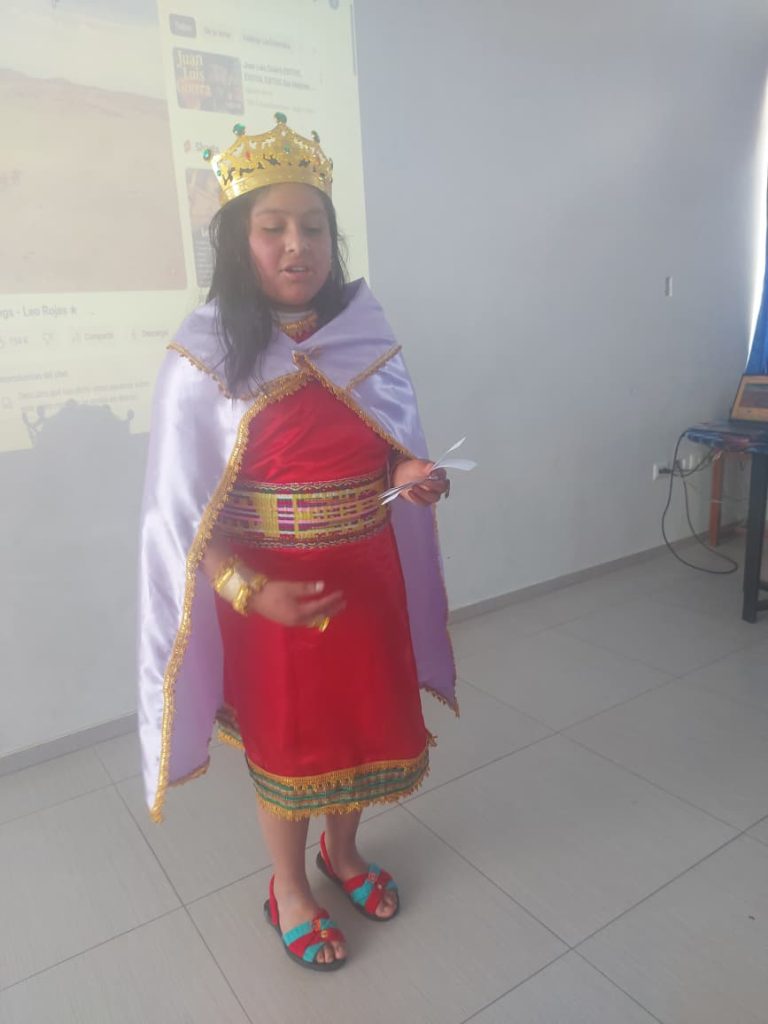 Die Fünftklässler wählten eine Figur aus der peruanischen Geschichte aus, die ihr persönliches Interesse weckte. Sie recherchierten in Büchern und im Internet über die ausgewählte Person und ihre Zeit und notierten die wichtigsten Informationen. Im Handwerklichen Gestalten zeichneten sie die zur Gestalt passenden Kleidungsstücke und fertigten diese mit Hilfe von Emilia an. Am Schluss präsentierten sie sich vor der Klasse in der Rolle der gewählten Person und begründeten ihre Wahl.