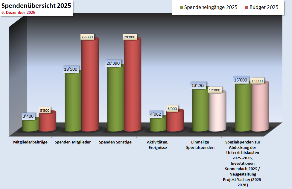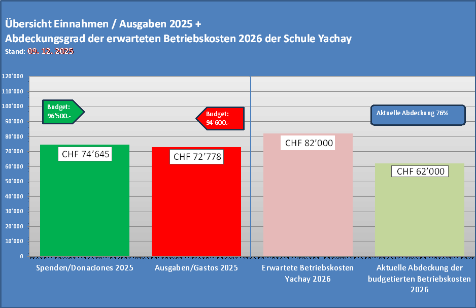 Das genaue Budget für die Kosten 2026 in Huancayo und auch die Schlussabrechnung der Schulkosten 2025 stehen noch aus. Im Moment sieht es in Peru nach einem leichten Überschuss aus, welcher dann für den Betrieb 2026 zur Verfügung stehen würde.