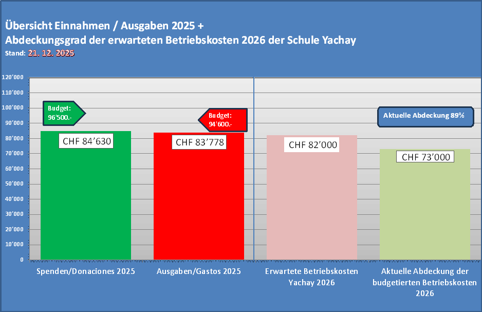 Das genaue Budget für die Kosten 2026 in Huancayo und auch die Schlussabrechnung der Schulkosten 2025 stehen noch aus. Im Moment sieht es in Peru nach einem leichten Überschuss aus, welcher dann für den Betrieb 2026 zur Verfügung stehen würde.