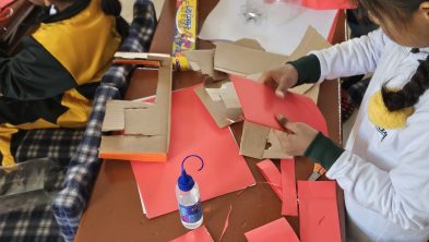 Im Fach Arte – Zeichnen/Gestalten stellen die Kinder der 2. Klasse zusammen mit unserer neuen Lehrerin Mariella aus grossen Petflaschen und Karton eine Geschenkbox her.
